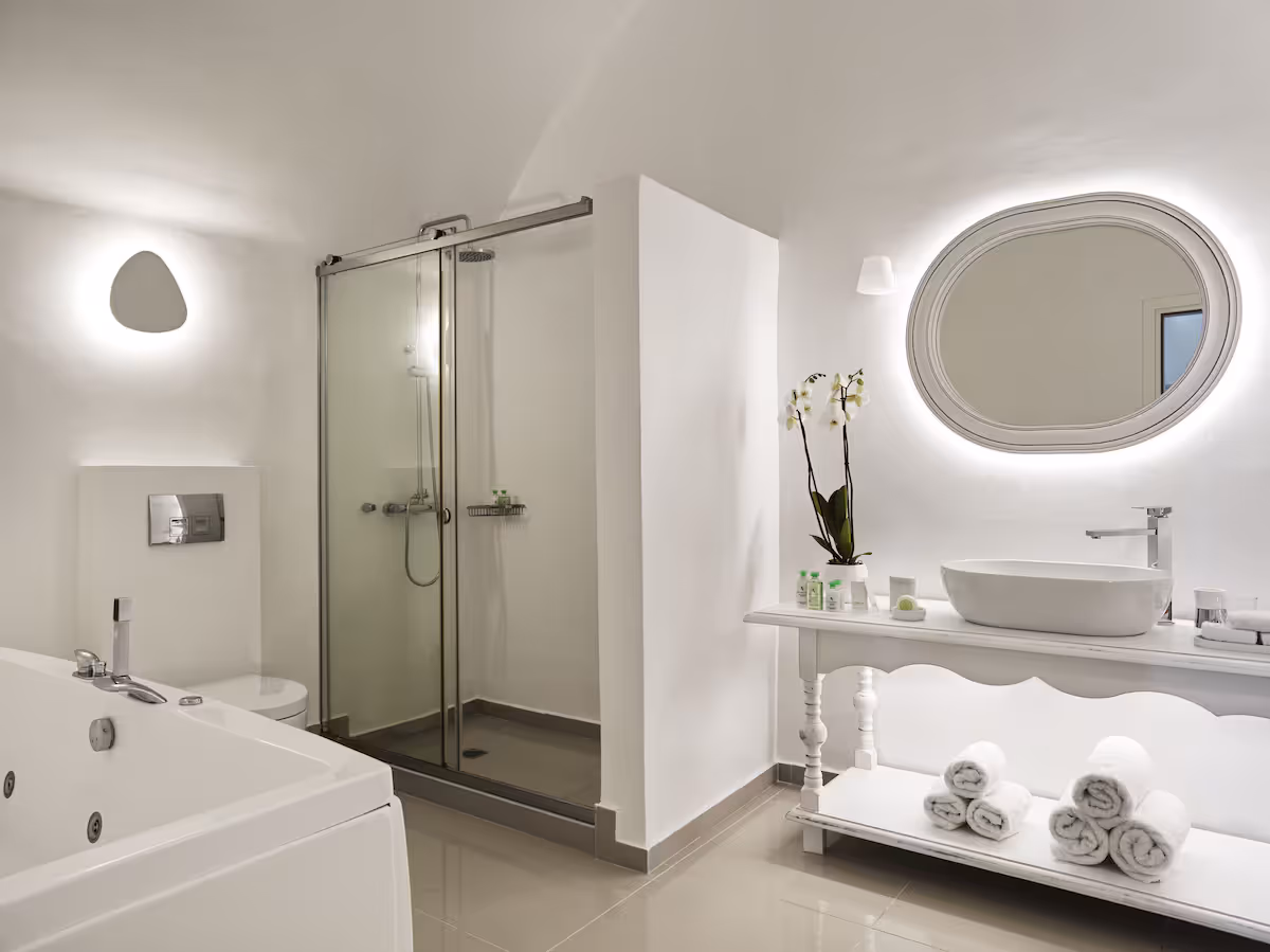 Purpose-built for romance, Honeymoon Petra Villas is a cliffside sanctuary in Imerovigli designed specifically for couples seeking intimacy, privacy, and exceptional caldera views—without the crowds of Oia.