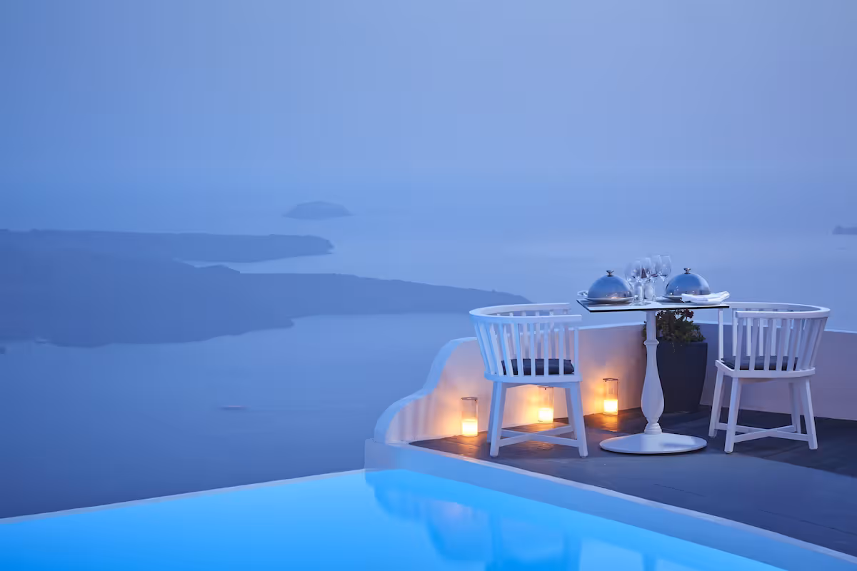 Wellness is not positioned as an add-on here — it shapes the entire behavioral rhythm of the property. Mornings tend to unfold slowly, afternoons remain unhurried, and evenings lean tranquil rather than social. Private heated pools overlook the caldera, where dramatic sunsets play out without the friction of crowded viewpoints. Guests frequently note the attentiveness of the staff, who are known for orchestrating thoughtful moments — from poolside celebrations to personalized touches that elevate longer stays.